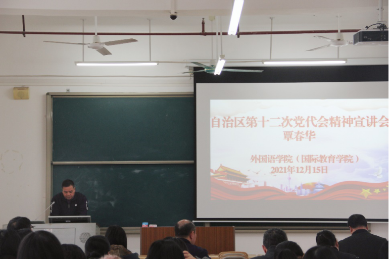 12月15日下午,必赢3003no1线路检测中心(国际教育学院)在格致楼602教室开展自治区第十二次党代会精神宣讲会,党委书记覃春华主持会议,全体教师参加会议。