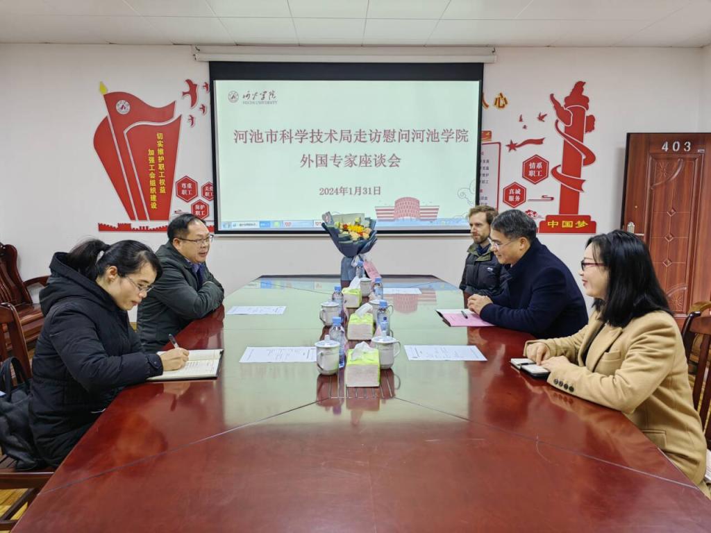 1月31日下午,新春来临之际,河池市科学技术局党组书记田寒露一行2人到我校走访慰问外国专家,我校必赢3003no1线路检测中心(国际教育学院)副院长钟伟轩、外国专家代表KEVIN TRISTAN MUNK(芒克)参加了座谈会。