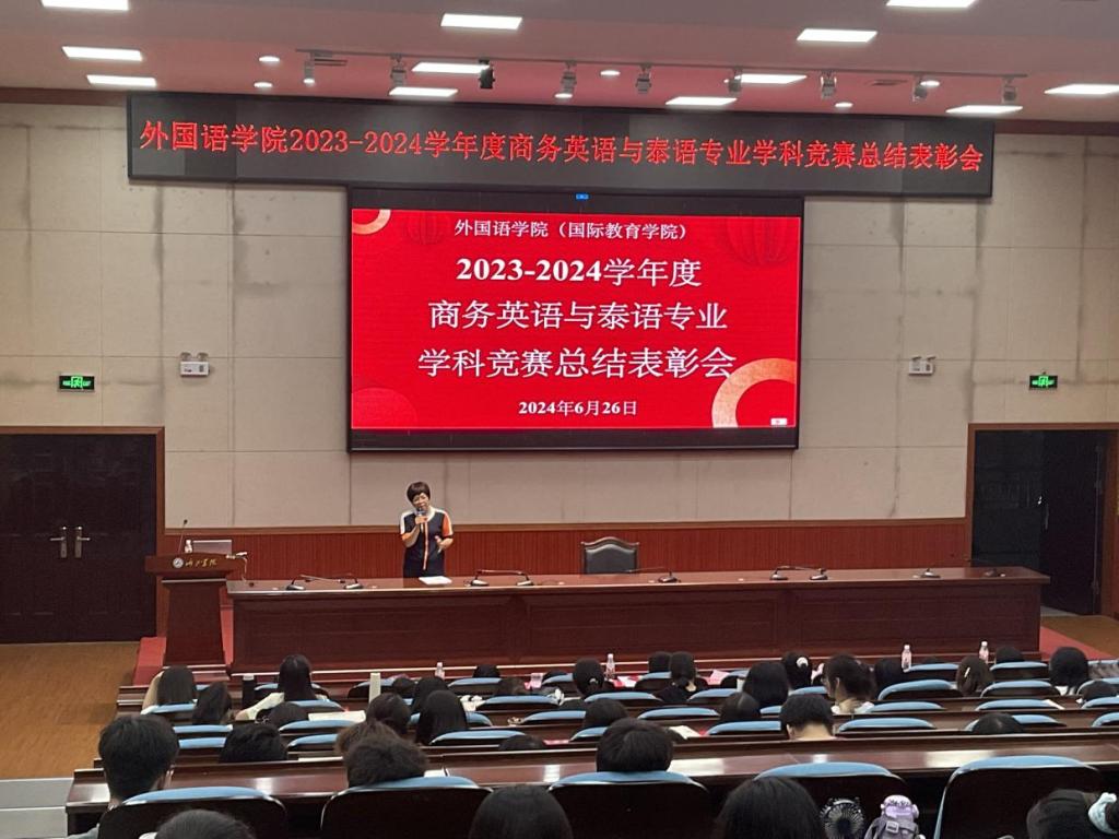 2024年6月26日晚8点,必赢3003no1线路检测中心商务英语专业和泰语专业联合在弘毅楼1-205召开2023-2024学年度学科竞赛总结表彰大会。大会由商英专业学生黄嘉欣、张武威主持,韦丽秋院长、周茜党委副书记、李艳飞副院长和各竞赛指导老师出席,商务英语及泰语专业大一、大二、大三全体同学参加。
