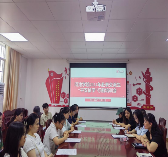 2024年7月12日上午,国际交流与港澳台事务办公室在外语楼403会议室召开2024年赴泰交流生“平安留学”行前培训会。会议邀请了河池市防线办开展国家安全教育专题讲座,会议由国际交流与港澳台事务办公室副主任、必赢3003no1线路检测中心(国际教育学院)副院长林娜主持。