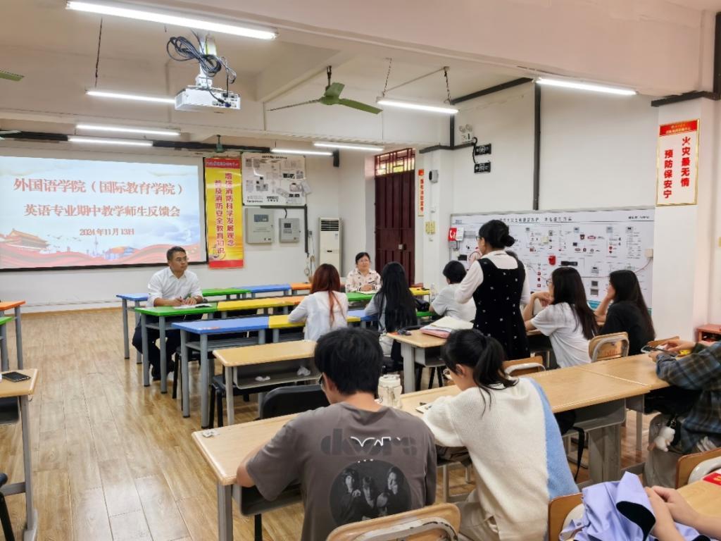 在英语专业教学反馈会上,学生代表们踊跃发言,不仅对教师的教学态度、教学内容等方面给予了高度评价,还针对《综合英语》、《视听说》、《英语教学法》、《翻译》等课程提出了一些建设性的意见和建议,如增加互动环节、强化英语语言应用能力培养等。教研室负责人认真听取了学生的意见,并就如何改进教学方法、提高教学质量进行了深入讨论和经验分享。钟伟轩副院长作总结发言并对相关问题进行了回应,并表示将会把大家的意见和建议进行梳理,并传达给相关教师,学院也将继续以学生为中心开展教学工作。
