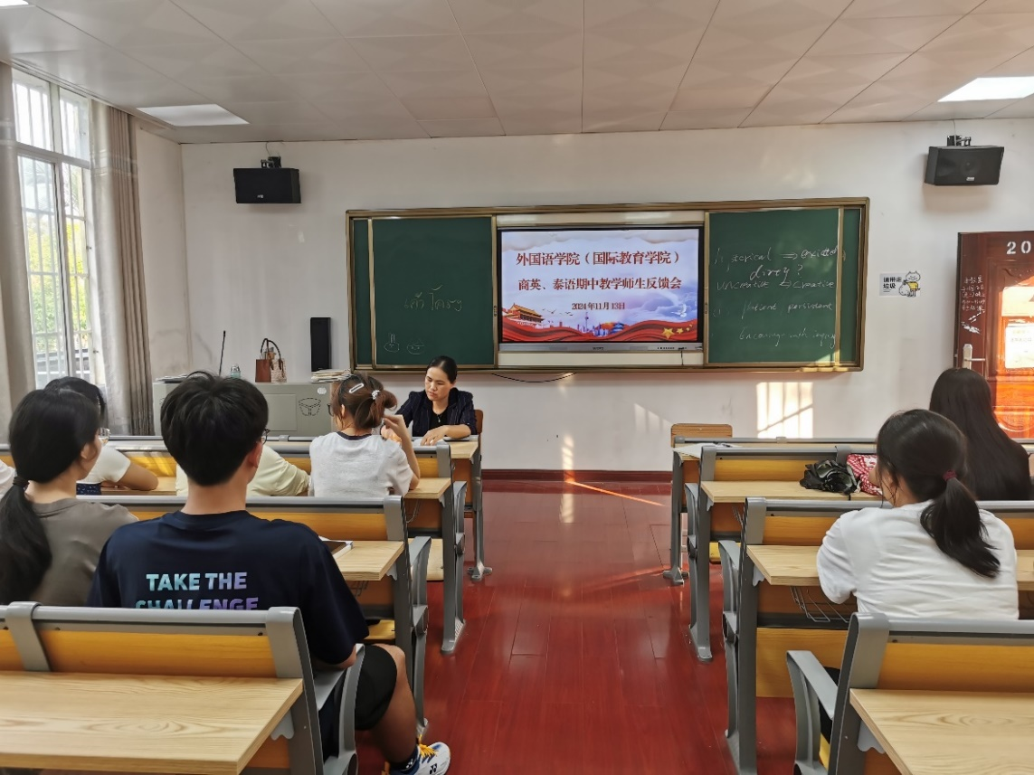 在商务英语、泰语专业教学反馈会上,学生代表就学习内容、课程设置安排,教学方法、学习方法,学习进度等方面提出了自己的意见和建议。有的学生希望教师能提供更多学习资源,便于学生课后自主学习;有的学生提出自己的学习困难,希望得到教师帮助等。