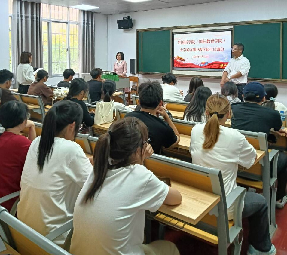 在大学英语课程期中教学反馈会上,钟伟轩副院长鼓励学生针对大学英语教学安排、教学内容、学习效果等方面进行交流与反馈。随后,学生代表们分别从自身学习体验出发,畅所欲言,提出了宝贵的意见和建议。大学英语教研室负责人耐心聆听,详细记录,针对比较突出的问题,如课堂学生参与度不高、英语听力难度大、小组活动开展困难等,与学生进行了深入细致的交流,共同探讨可行的改进措施。