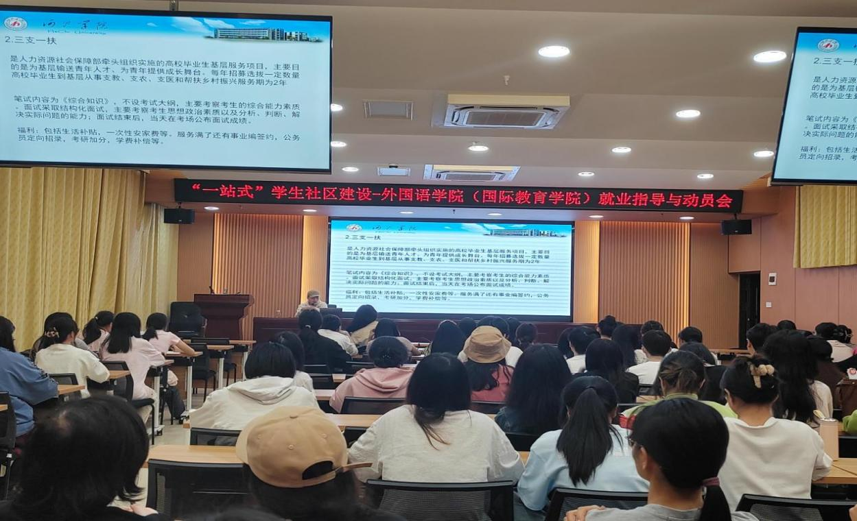 为充分发挥党建引领作用,扎实推进“一站式”学生社区建设,助力学生高质量就业,2025年3月25日,学院在格致楼102召开“一站式”学生社区建设-必赢3003no1线路检测中心(国际教育学院)就业指导与动员会,学生第一党支部书记彭万林主持会议,学院党委副书记周茜出席会议,2025届全体师范英语专业毕业生参会。