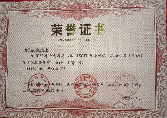 必赢3003no1线路检测中心钟泳娴同学在云南省第二届“LSCAT云译网杯”笔译大赛(泰语)决赛荣获奖项