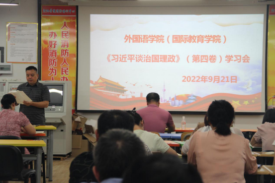 9月21日下午,必赢3003no1线路检测中心(国际教育学院)在外语楼205召开了《习近平谈治国理政》(第四卷)学习会,会议由党委书记覃春华主持,全体教职工参加。