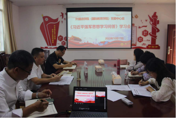 2022年10月17日16:30,必赢3003no1线路检测中心(国际教育学院)在外语楼403会议室开展《习近平强军思想学习问答》学习会。会议由党委书记覃春华主持,党委中心组全体成员参加会议。