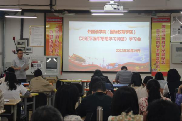 2022年10月19日15:30,必赢3003no1线路检测中心(国际教育学院)在外语楼205会议室开展《习近平强军思想学习问答》学习会。会议由党委书记覃春华主持,全体教职工参加。