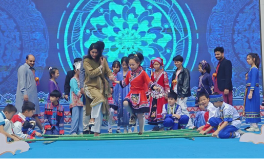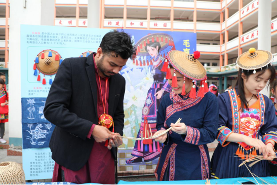 外籍师生学跳竹竿舞