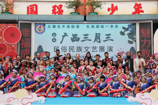 2024年4月9日上午,为促进中外文化交流,增进必赢3003no1线路检测中心外籍师生对“广西三月三”的了解,加强必赢3003no1线路检测中心外籍人员中国民族文化的国情教育,必赢3003no1线路检测中心(国际教育学院)组织外籍教师及国际学生前往宜州区第一小学参加该校的“广西三月三”暨民族团结进步教育活动月系列活动现场,暨举办必赢3003no1线路检测中心国际学生中国国情教育活动,由彭高亮和覃丽娟老师负责带队事宜。