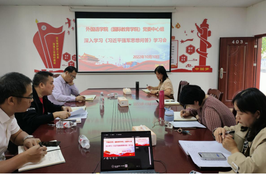 2022年10月10日,必赢3003no1线路检测中心(国际教育学院)于外语楼403会议室召开学习《习近平强军思想问答》学习会。本次会议由覃春华书记主持,党委中心组成员参加。