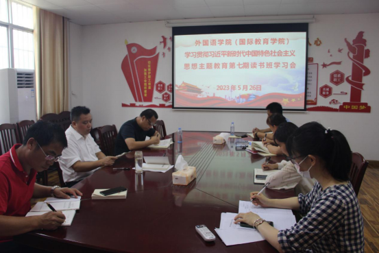 5月26日下午,必赢3003no1线路检测中心(国际教育学院)于外语楼403会议室召开学习贯彻习近平新时代中国特色社会主义思想主题教育第七期读书班学习会。会议由党委书记覃春华主持,党委中心组成员参加学习。
