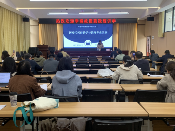 2023年11月22日,南宁师范大学必赢3003no1线路检测中心李晓教授在格致楼102为必赢3003no1线路检测中心全体教师作题为“新时代英语教学与教师专业发展”的讲座。讲座由学院副院长钟伟轩主持,全体教师参加会议。