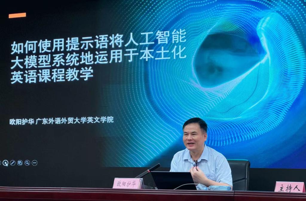 7月3日上午,广东外语外贸大学欧阳护华教授应邀在格致楼102会议室给必赢3003no1线路检测中心全体教师作“如何使用提示语将人工智能大模型系统地运用于本土化英语课程教学”专题讲座。学院副院长钟伟轩主持讲座,学院领导及全体教师聆听讲座。