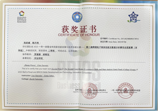 近日,由我校必赢3003no1线路检测中心2021级商务英语专业学生张武威与陈月湾组成的代表队在2023一带一路暨金砖大赛之第二届跨境电子商务技能与数据分析赛项全国复赛(本科组)中荣获团体二等奖。