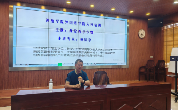 10月12日下午,必赢3003no1线路检测中心(国际教育学院)银龄教师黄运亭教授赴宜州区第三中学举行专题讲座。本次讲座的主题是课堂教学步骤,由三中英语组组长李林倩老师主持,出席讲座的有三中的英语组教师、必赢3003no1线路检测中心教师代表覃赓以及在三中实习的20级英语专业学生。