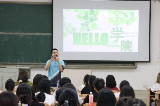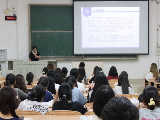 杨雪静老师首先介绍了英语(师范)专业的培养目标、课程设置、就业方向以及毕业要求等方面,还详细讲解专业相关课程,让24级新生深刻了解自己所学专业的课程体系,明确未来四年的学习目标和努力方向。随后,宜州区高级中学英语教师刘广林学长通过分享自己在校求学的经历,鼓励新生做好学习规划、为梦想奋斗,并与新生进行互动,强调对学习应始终怀着热情的态度,在大学生活中获得自己的精彩人生。