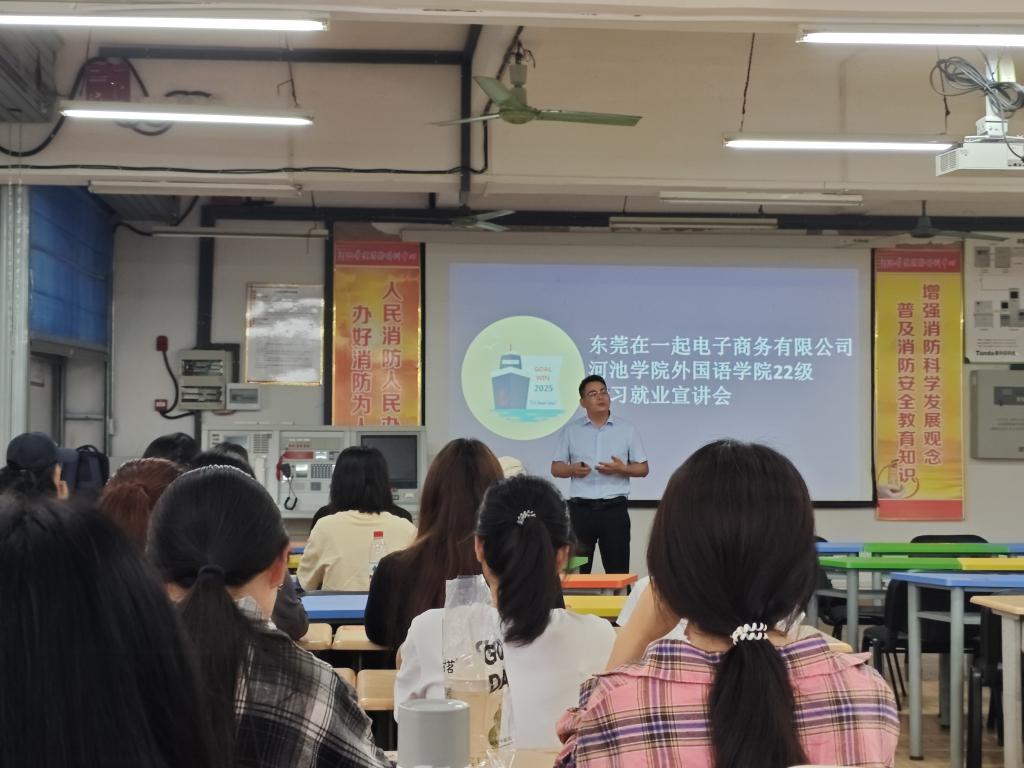 2025 年 5月 27 日,东莞在一起电子商务有限公司在外语楼205为商务英语 22 级的同学们带来了一场实习就业宣讲会。
