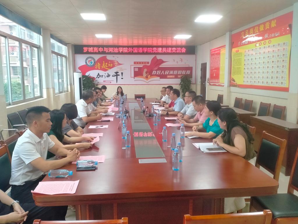 双方参会人员分别就支部特色创建、主题党日活动开展、业务加党建建设、一院一品校园文化品牌创建、英语专业人才培养、AI辅助高中英语教学和教研课题申报等话题展开深入交流,探讨合作的契合点,探索提高教学质量、更好地服务学生的有效途径,争取为河池的教育事业高质量发展贡献力量。(作者:李凤,拍照:李凤 杨勇, 校对:王勇亮,审核:韦合 周茜)