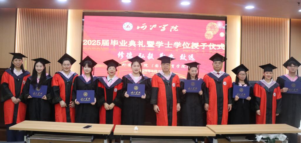 发言完毕后,学院领导班子为毕业生正冠拨穗、授予学士学位,并与学生们合影留恋,2025届毕业典礼圆满结束。这四年里,毕业生们不仅收获了学历与荣誉,更收获了珍贵的友谊与难忘的回忆。最后,学院愿大家可以执理想之笔,在人生长卷上挥毫泼墨。以勇气为帆、智慧为桨,穿越时代浪潮,抵达心之所向的星辰大海,所行皆坦途,所遇皆盛放。(作者:郁珍艳 拍摄:郁珍艳 校对:李凤 审核:周茜)