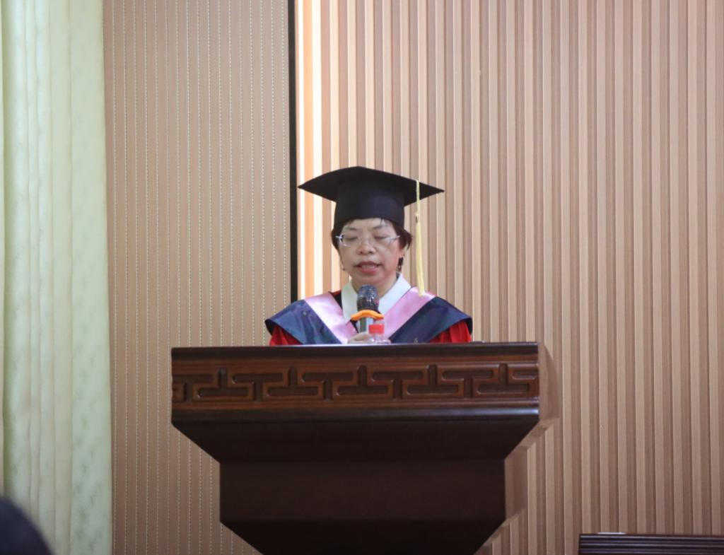 毕业典礼暨学士学位授予仪式在激昂雄壮的国歌声中拉开帷幕,随后学院院长韦丽秋致辞。她以温暖的话语寄语毕业生:“ 请你们牢记要有大思维、大视野、大格局,紧跟时代步伐,做一个有修养、有责任心、敢于担当的人”。院长赠言完毕,学生代表廖启月上台发言,她用真情实感表达了对学院对母校以及对老师们的感谢与祝愿。教师代表黄小珂老师用坚定的话语展示了教师们育人使命的坚守,并用最真心的祝愿表达了对学生们的不舍。