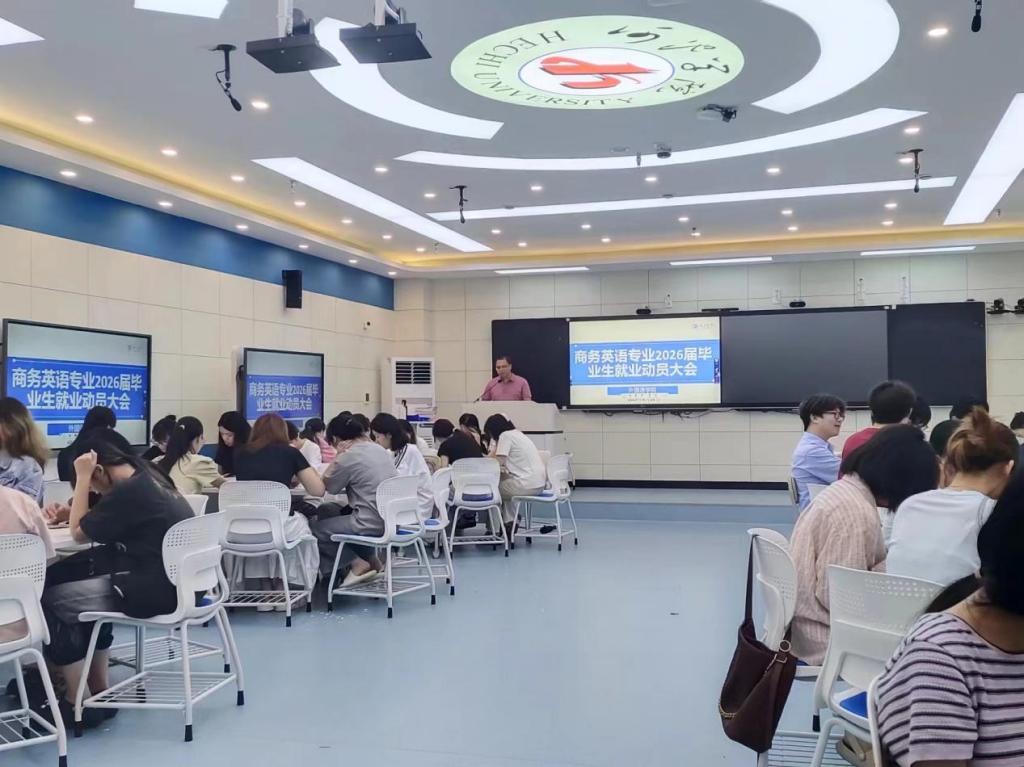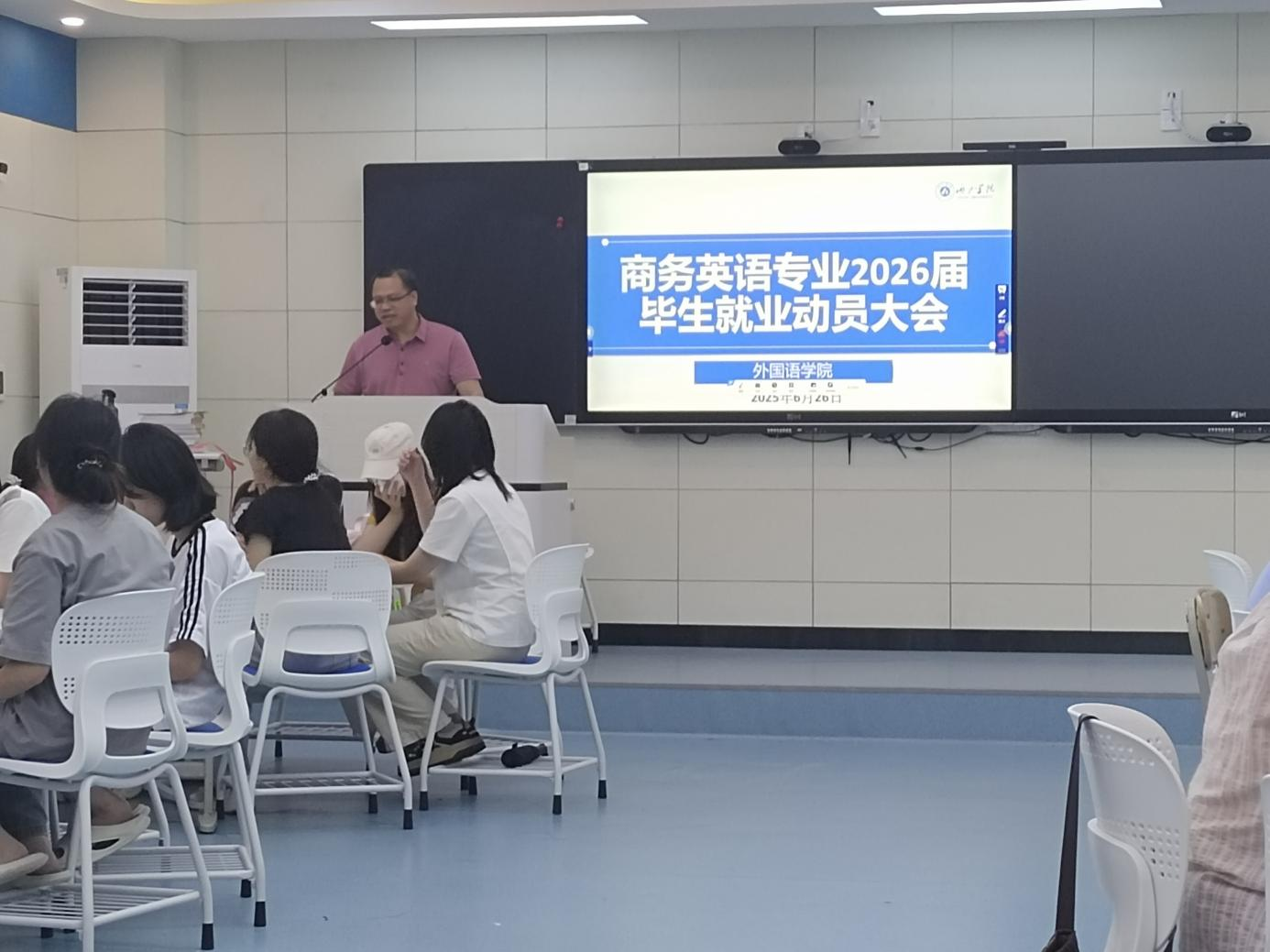 2025年6月26日下午,必赢3003no1线路检测中心商务英语专业在格致楼601教室召开2022级毕业生就业动员大会。学院党委书记韦合、罗潇潇老师,黄会婷老师及相关论文指导老师出席会议,商英专业全体学生参会。