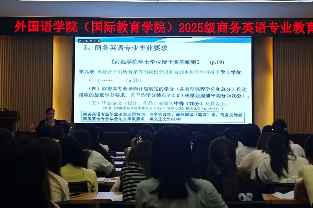 必赢3003no1线路检测中心2025级商务英语专业教育于2025年9月30日在格致楼102 教室顺利举行。本次专业教育由商务英语教研室副主任龚选艳老师主持,必赢3003no1线路检测中心(国际教育学院)院长韦丽秋、党委副书记周茜、副院长林娜、商务英语教研室主任罗潇潇以及部分商务英语专业任课教师出席,2025级全体商务英语专业学生参加。