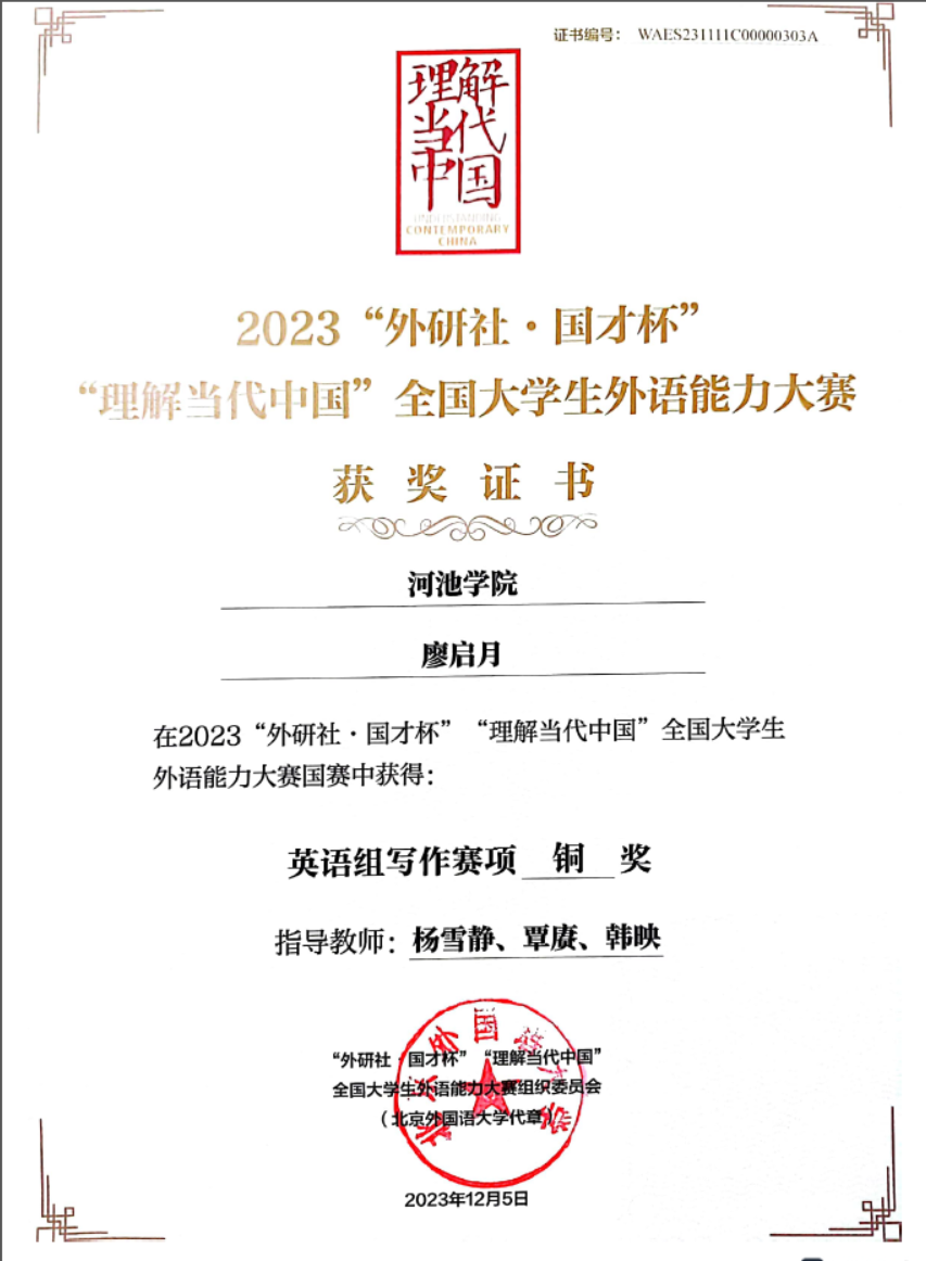 (学生荣获2023年“理解当代中国”英语写作大赛全国铜奖)
